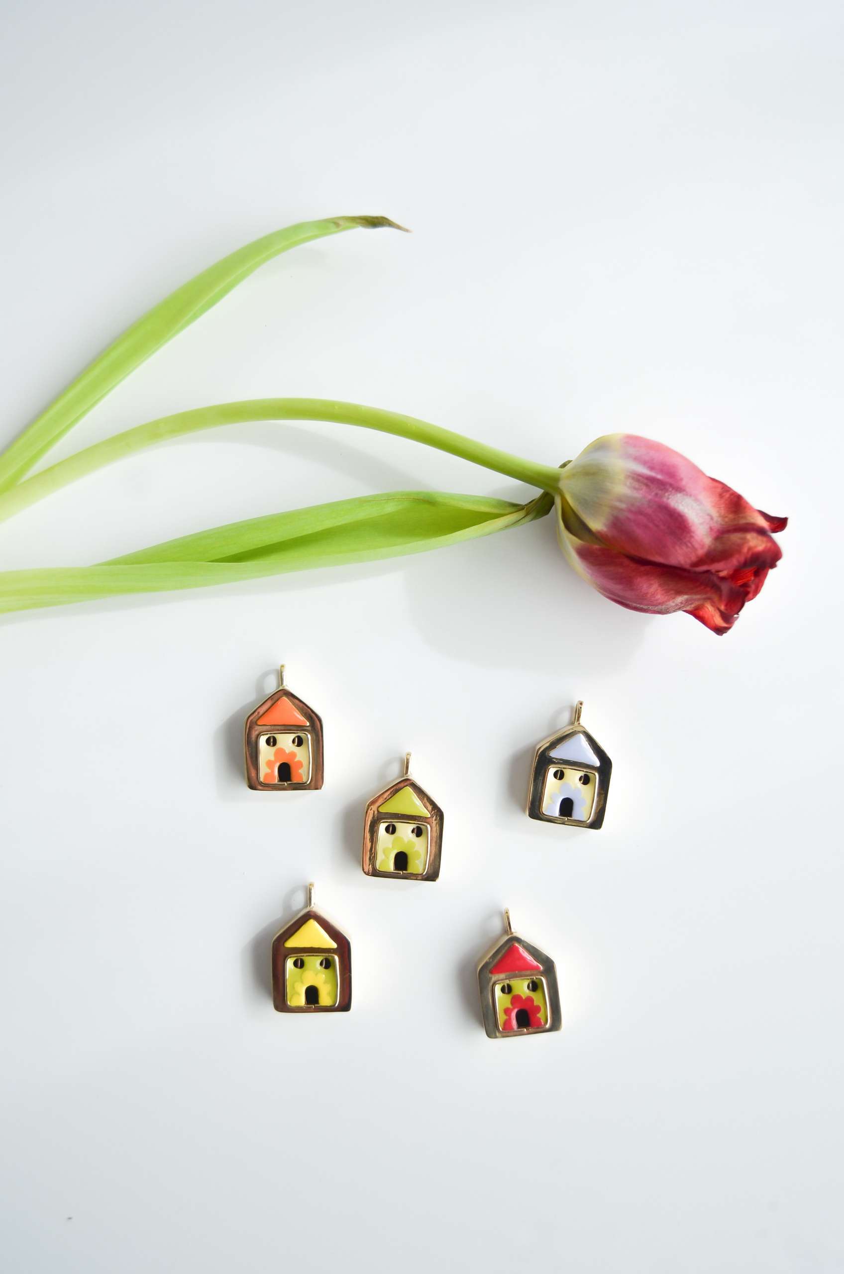 El pendiente está realizado en latón esmaltado con el perno (la parte que va en contacto con la oreja) soldado en plata 925 para garantizar comodidad y evitar alergias. Todas las piezas pueden hacerse 100% en plata o ser bañadas o chapadas tanto en plata como oro.