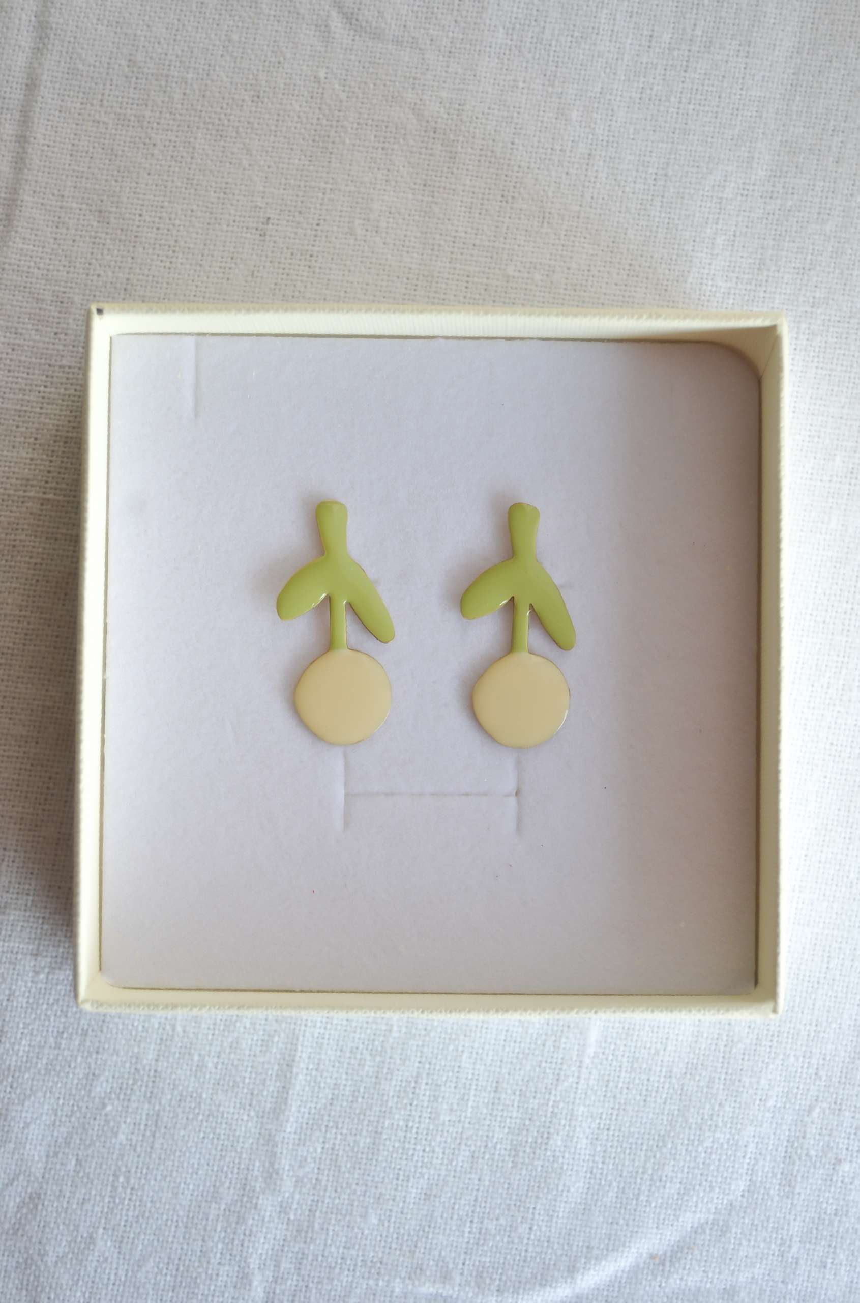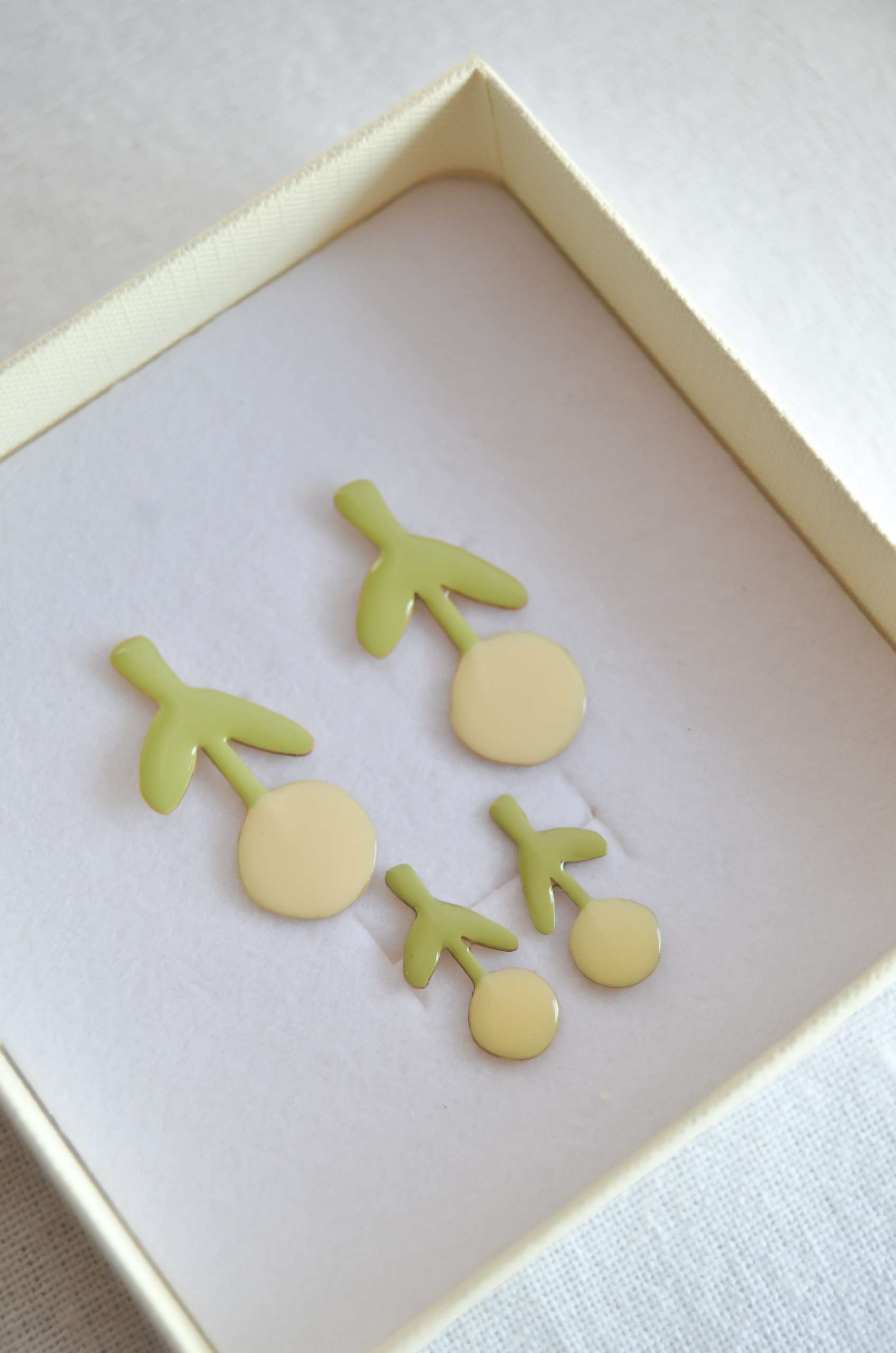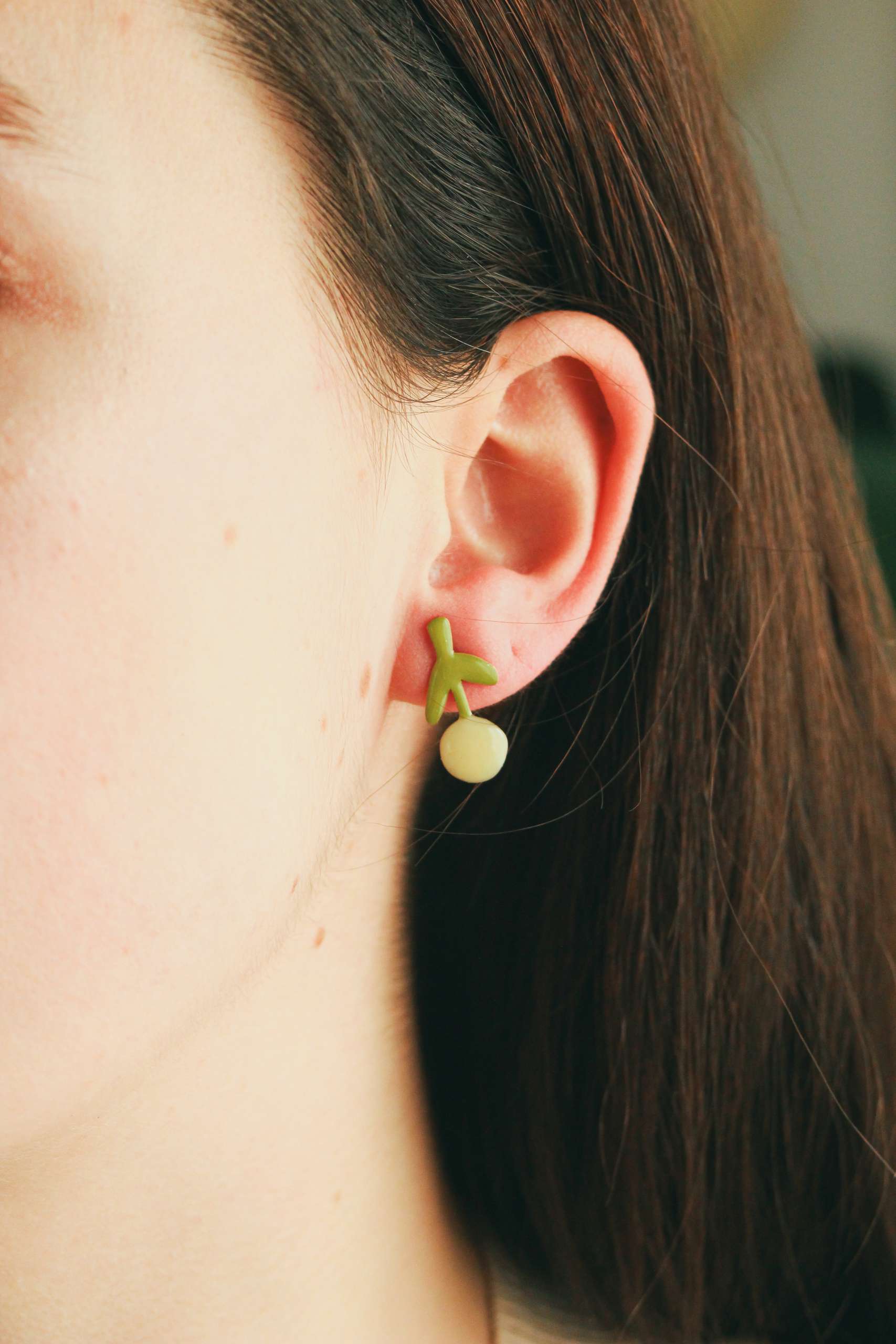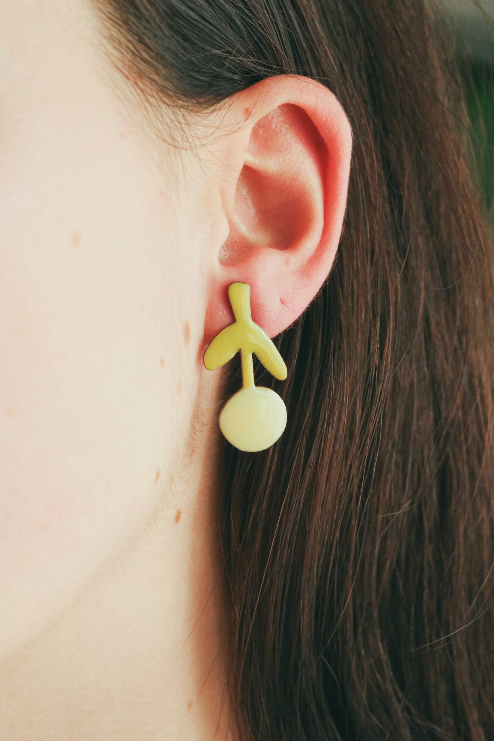 El pendiente está realizado en latón esmaltado con el perno (la parte que va en contacto con la oreja) soldado en plata 925 para garantizar comodidad y evitar alergias. Todas las piezas pueden hacerse 100% en plata o ser bañadas o chapadas tanto en plata como oro.