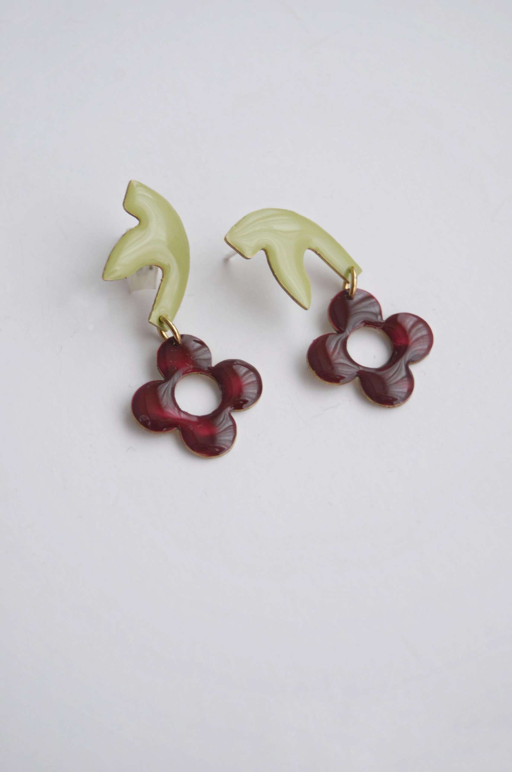 El pendiente está realizado en latón esmaltado con el perno (la parte que va en contacto con la oreja) soldado en plata 925 para garantizar comodidad y evitar alergias. Todas las piezas pueden hacerse 100% en plata o ser bañadas o chapadas tanto en plata como oro.