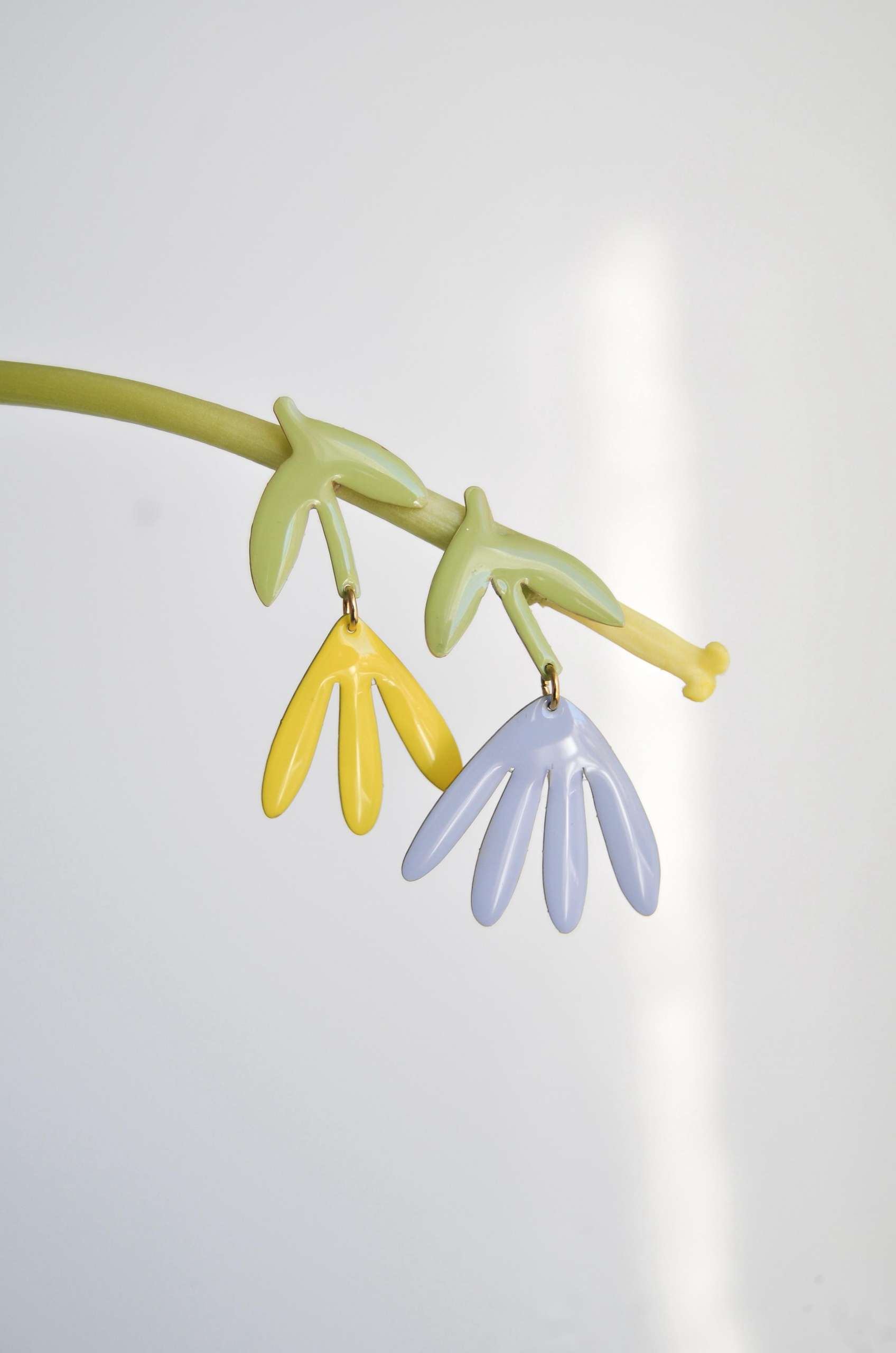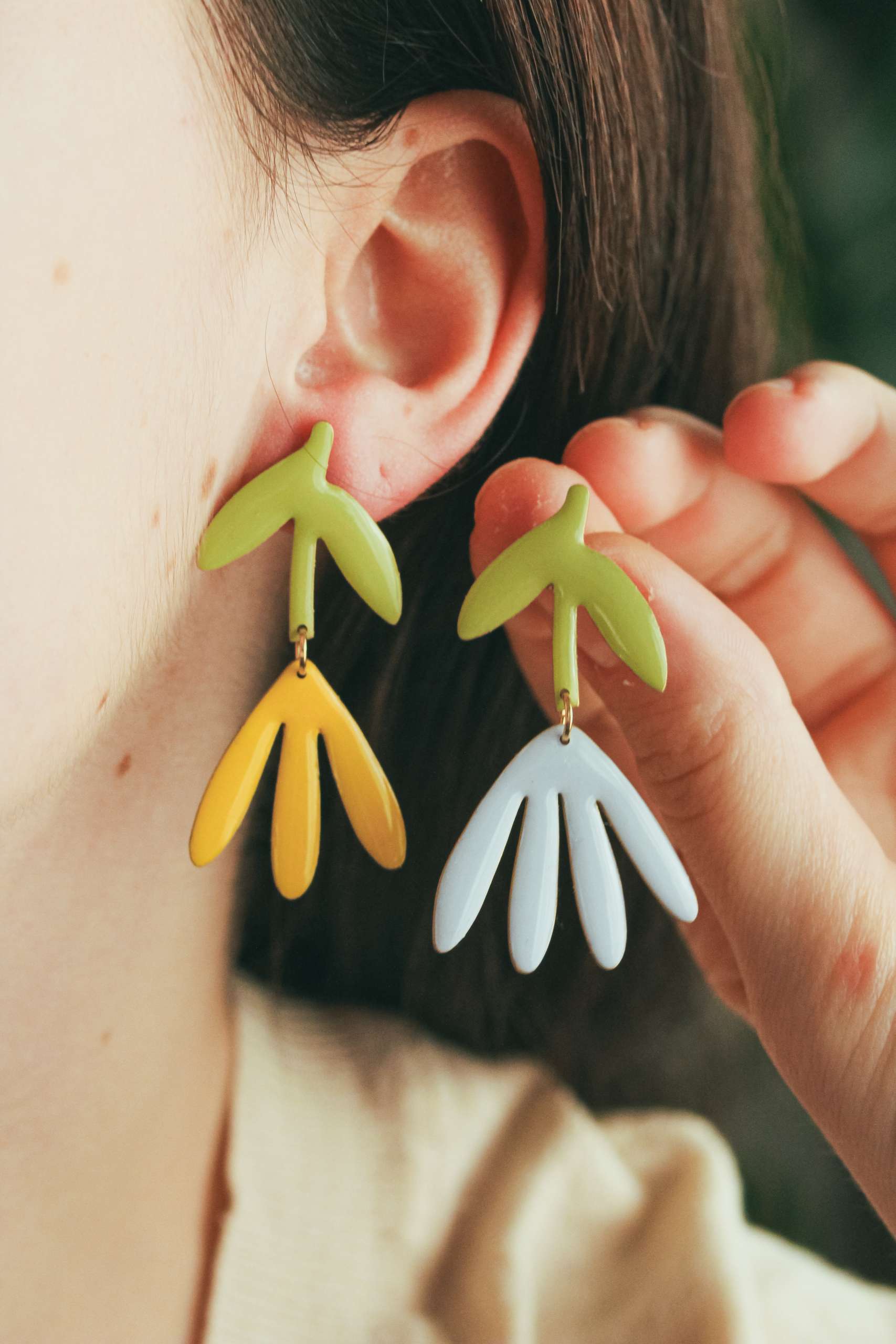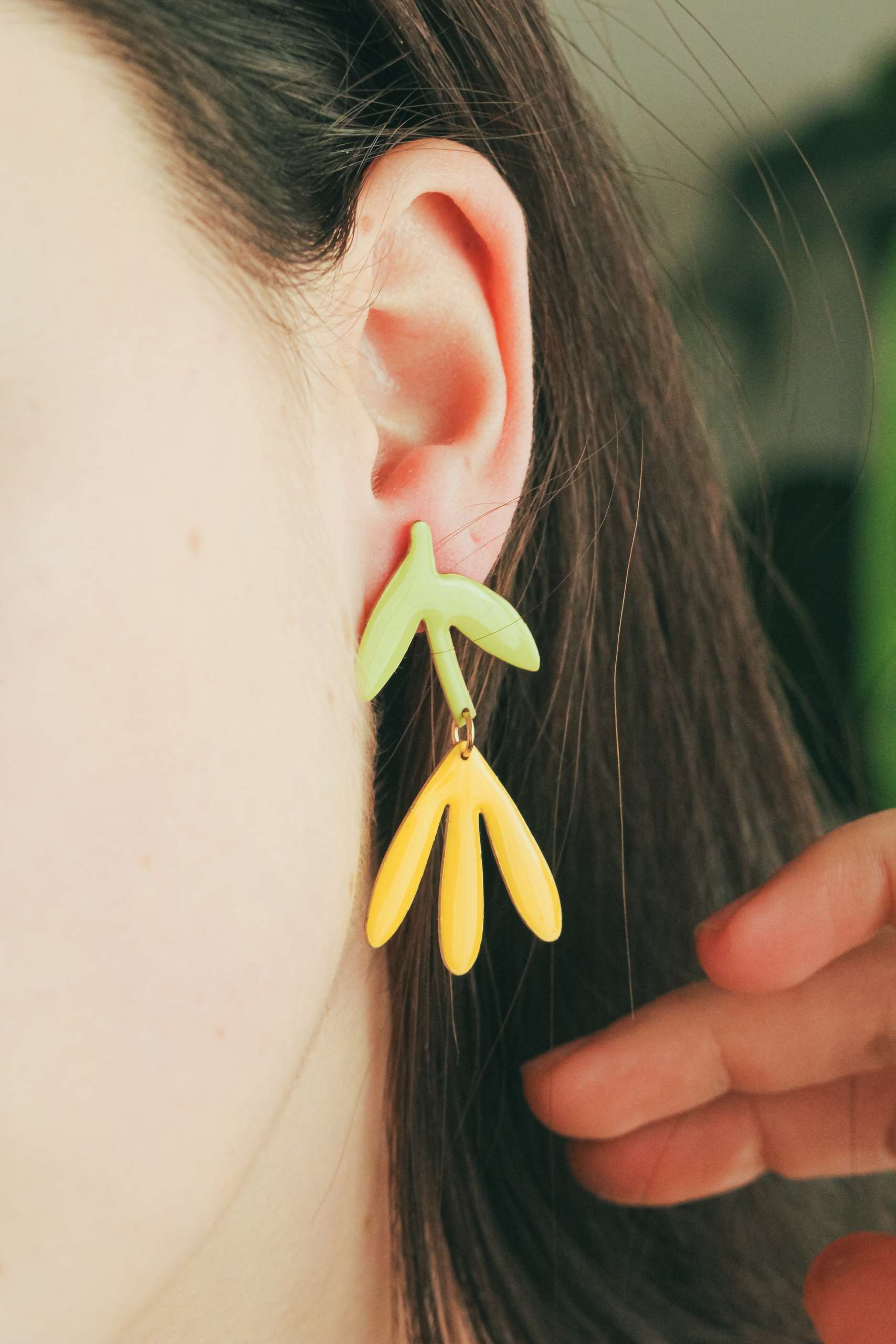 El pendiente está realizado en latón esmaltado con el perno (la parte que va en contacto con la oreja) soldado en plata 925 para garantizar comodidad y evitar alergias. Todas las piezas pueden hacerse 100% en plata o ser bañadas o chapadas tanto en plata como oro.