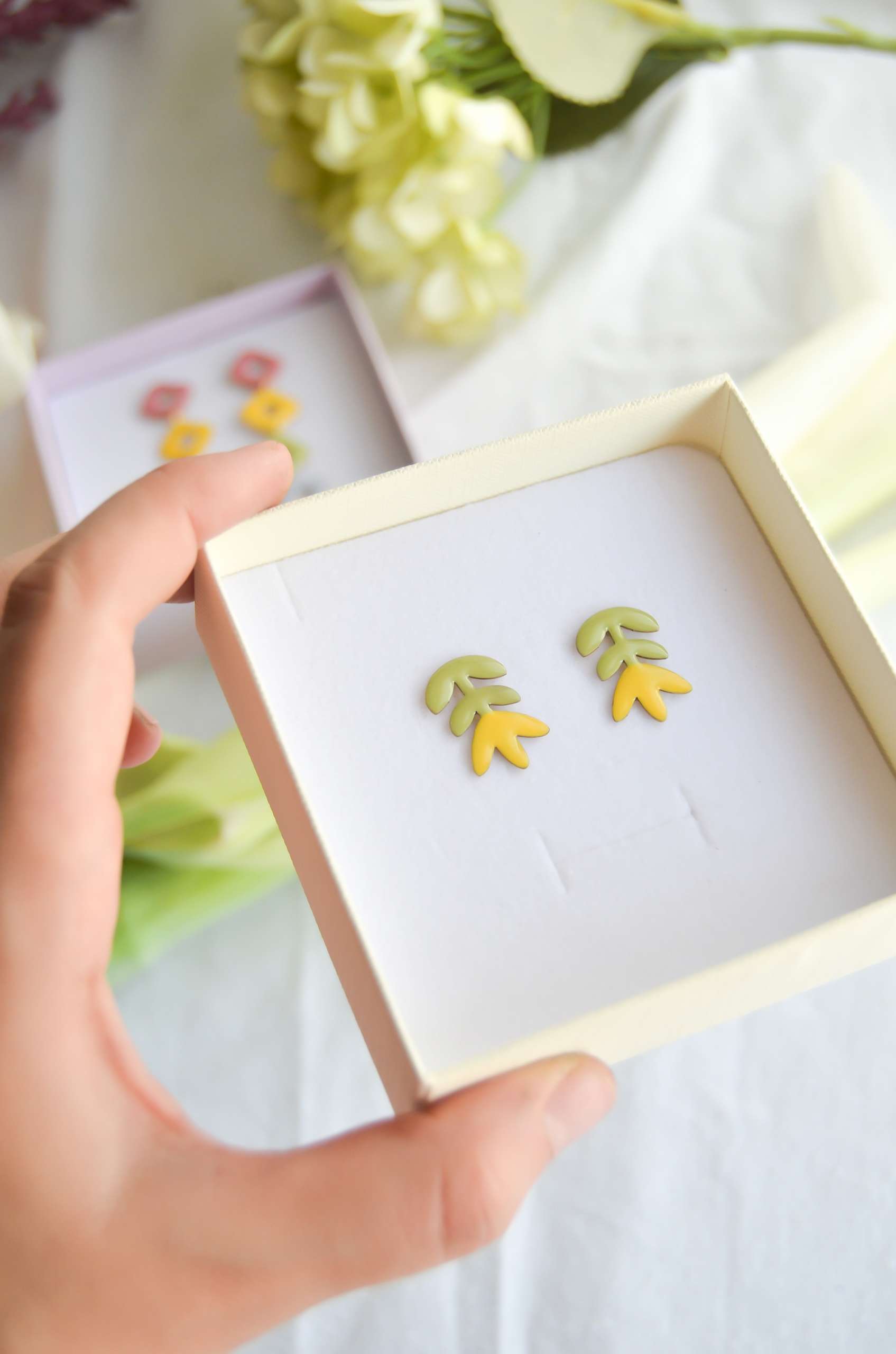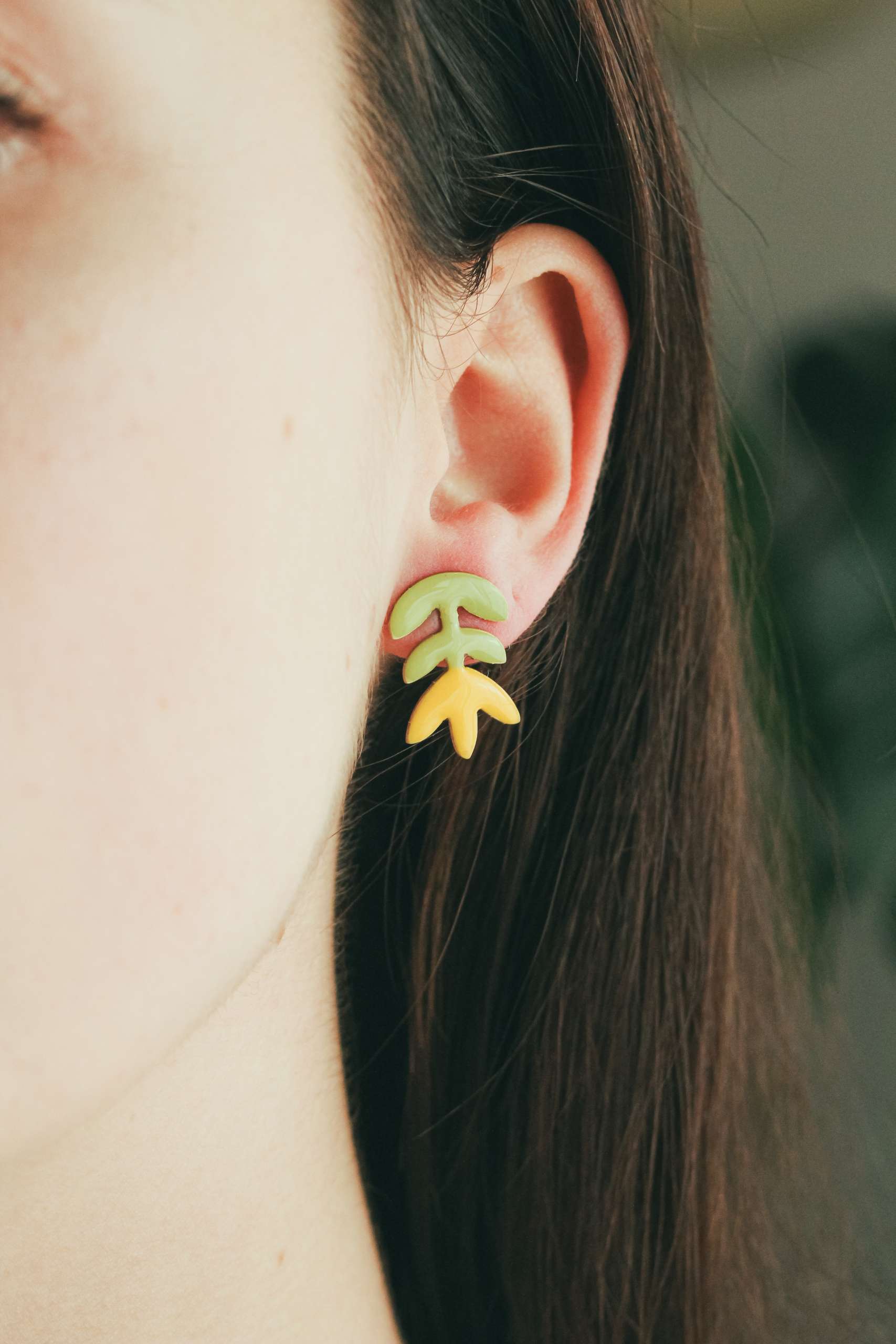 El pendiente está realizado en latón esmaltado con el perno (la parte que va en contacto con la oreja) soldado en plata 925 para garantizar comodidad y evitar alergias. Todas las piezas pueden hacerse 100% en plata o ser bañadas o chapadas tanto en plata como oro.