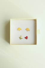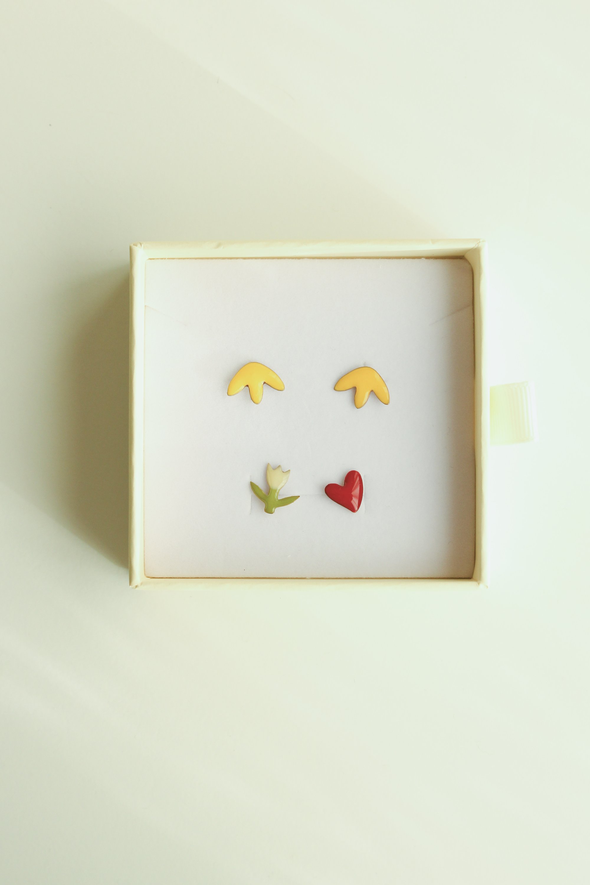 El pendiente está realizado en latón esmaltado con el perno (la parte que va en contacto con la oreja) soldado en plata 925 para garantizar comodidad y evitar alergias.